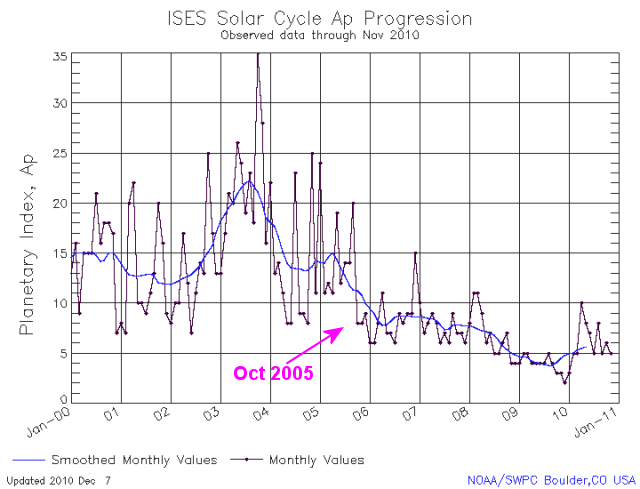 The Sun’s magnetic field extends far out into space. It not only surrounds Earth, it also extends well beyond Pluto. The more powerful the Sun’s magnetic field, the more it alters the Earth’s geomagnetic field. The Ap index is measure of this alteration. The Ap index measurements began in the 1930’s. The chart that follows shows the Ap index beginning in 2000 through most of 2010. The peak in the 2003 -2004 time frame is Cycle 23. The Solar activity was high during that time, reaching an Ap index of 35 at its peak. In October 2005, the Ap Index dropped significantly and has remained very low since then.