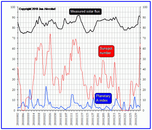 The following chart shows the Ap index from October 2010 through the end of December 2010. Note that the index has bottomed out at zero on several occasions. This chart also illustrates the how well the Solar Flux, the Sunspot Number and the Ap Index correlate.