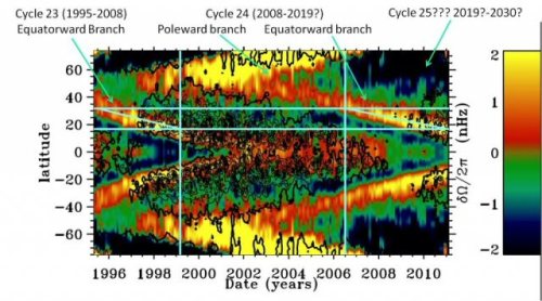 The annotated chart’s yellow and red bands trace the solar jet streams. The black contours denote sunspot activity. Cycle 24 (the current cycle) streams can be seen beginning about 1998-1999 at about 60° lattitude north and south. These streams begin converging toward the equator. At about 22°, sunspot activity begins. Ultimately the streams will reach the equator at a time of solar maximum. See Cycle 24 and the Butterfly Diagram for more on this.