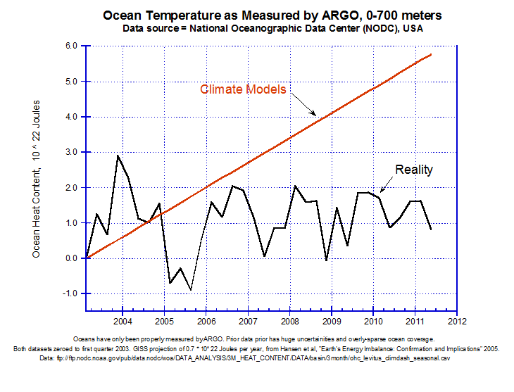Evans says: the climate models predict the oceans should be warming. We’ve only been measuring ocean temperature properly since 2003, using the ARGO system. In ARGO, a buoy duck dives down to 2000m, slowly ascends and reads the temperatures on the way, then radios the result back by satellite to HQ. Three thousand ARGO buoys patrol the oceans constantly. They say that the ocean temperature since 2003 has been basically flat. Again, reality is very different to the climate models.