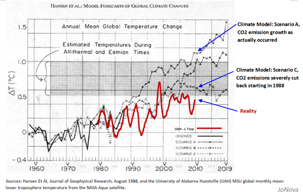 First: Evans examines the Climate Model predictions made by James Hansen (the so-called godfather of AGW) during his testimony to the US Congress in 1988.(click on chart to enlarge)