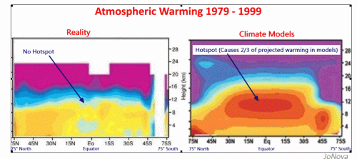 Evans says: “the climate models predict a particular pattern of atmospheric warming during periods of global warming. In particular, the most prominent change they predict is a warming in the tropics about 10 km up, the so-called “hotspot”. But we have been measuring atmospheric temperatures by weather balloons since the 1960s, and millions of weather balloons say there was no such hotspot during the last warming from 1975 to 2001. The hotspot is integral to their theory, because it would be evidence of the extra evaporation and thickening of the water vapor blanket that produces two thirds of the warming in the climate models…”
