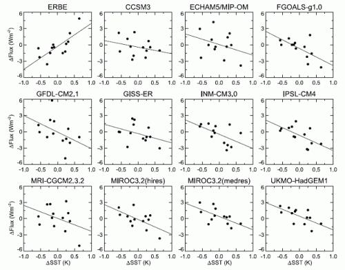 Fourthly: Evans hits on one of the most discussed topic in recent times—that of outgoing radiation into space. Note in the chart below that the top row left is the actual measurements of outgoing radiation by the stat elite ERBE program (Earth Radiation Budget Experiment-click here for more information.) The other boxes are climate model predictions. (Chart source=Lindzen and Choi 2009)