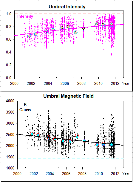Livingston and Penn have studied over 1700 spots and they see a trend in which the darkest parts of the sunspot umbra have become warmer (45K per year) and their magnetic field strengths have decreased (77 Gauss per year**), independently of the normal 11-year sunspot cycle.