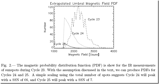 Using a linear decrease of 65 Gauss per year and a cycle duration of 11 years, they computed the magnetic probability distribution function for Cycles 24 and 25. Using this, a sunspot number is forecast. Cycles 24 and 25 are shown along with actual data from Cycle 23 in the chart below from their paper: