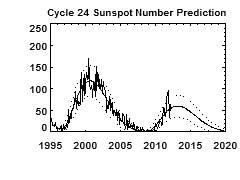 Dr Hathaway of NASA has revised his Cycle 24 sunspot forecast. He predicts a smoothed sunspot number maximum of about 60 in the Spring of next year. Cycle 24 will be the smallest in about 100 years. For the record, his forecast graphed is shown below: