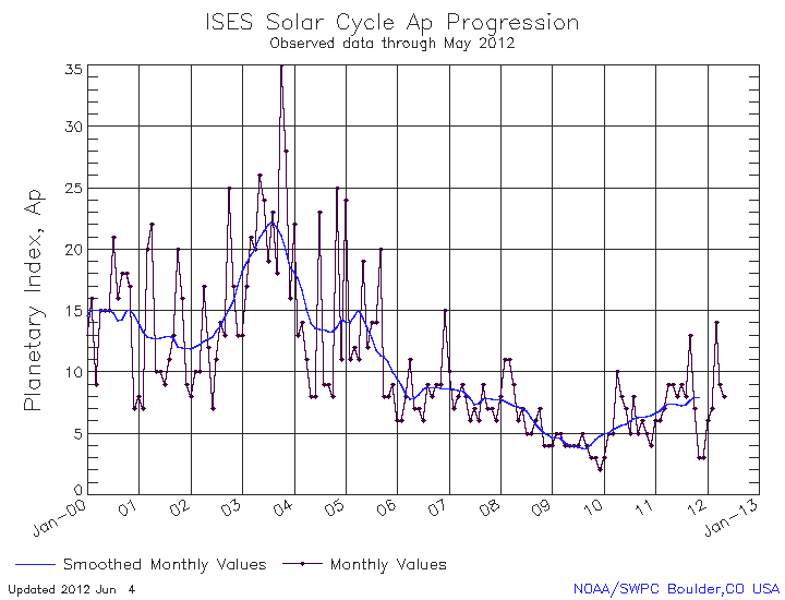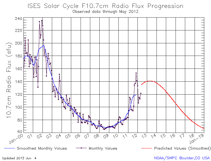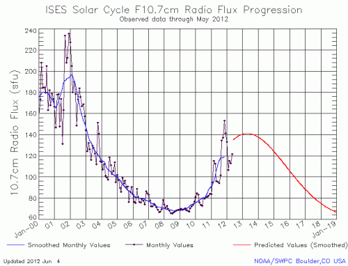Not much new. Solar Cycle 24 is tracking the recent forecasts and should reach a Maximum in the Spring of 2013. Below are the updated through May charts (click on charts to clarify):