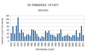 • …this chart shows the the number of extreme violent tornadoes on the decline since the 1970’s, contrary to “consensus” science forecasts.