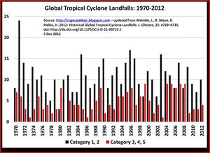 •… This graph plots the ‘power dissipation’ of hurricanes that made landfall on U.S. coasts, which has also declined over the last few years, revealing no trend up/down since 1900. Note the reduction of this metric for 2012, which government scientists have stated to be the warmest year ever for the U.S.