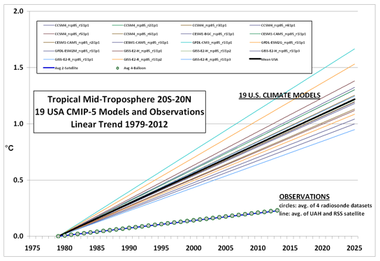 The following graph from Dr. Roy Spencer is even more dramatic. While Dr. Christy shows the average, Dr. Spencer shows how the individual predictions of 19 US models are all well above actual observations. And the EPA is trying to base policy on this?