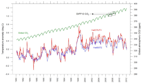 In fact, temperature trends in the middle and upper troposphere are flat. For example, a look at the 200 mb level from the Hadley Center Balloon Data shows no rise at all.