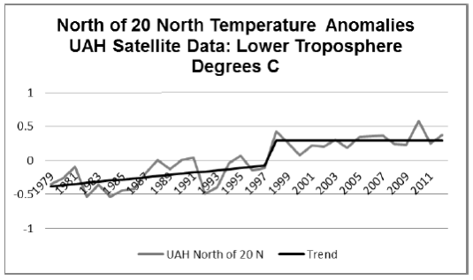 The first of the three comes from the warmers contention that a hot spot would occur in the tropical atmosphere. This has been proven to not exist time and again based on weather balloons and satellite temperature measurements. Bastardi provides the following charts to illustrate the lack of a hot spot.