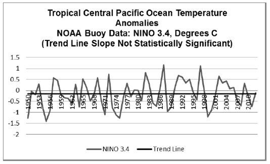 The figure below shows the Tropical Central Pacific Temperatures. Similarly, it shows no statistically significant slope. There is simply no evidence of EPA’s assumed Tropical Hot Spot.