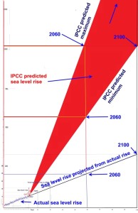 “Twenty five percent of the populations of these 1,700 cities would be living below sea level by 2100 and 79 cities with a combined population of 835,000 would be submerged by 2023 and about half of the population of Fort Lauderdale, Hoboken, and Palm Beach would be submerged by 2023 according to Strauss. The basis for these amazing conclusions is apparently a 12 inch (222 cm) per decade rise of global sea level, the maximum IPCC estimate, which is postulated to be caused by increasing atmospheric CO2.