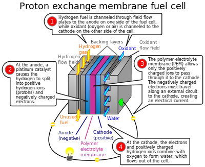 The whole idea here is to react a molecule of O2 and two molecules of H2 to make  two molecules of water (2H2O) and to take some of the energy of this reaction away as electrical energy.  Remembering your chemistry labs, if these two elements are combined under normal circumstances, say by using a spark, water will be produced and a lot of heat is released.  That would be ok in an internal combustion engine, but not in fuel cell.  Fuel cells are more efficient in extracting the H2/oxygen reaction energy than is an internal combustion engine.  Following the steps 1 through 4 above we note that H2 and O2 are channeled into the fuel cell block on different sides with the H2 going to the anode and the O2 to the cathode.  A catalyst on the anode side splits the H2 into protons and electrons.  Between the anode and the cathode is a membrane. Protons can pass through the membrane into the cathode side where the O2 is.  The electrons are drawn to the positive charge on the cathode side but can only go there by an external route creating an electrical current.   The current is used to make the motor turn. The water is continuously removed from the fuel cell.