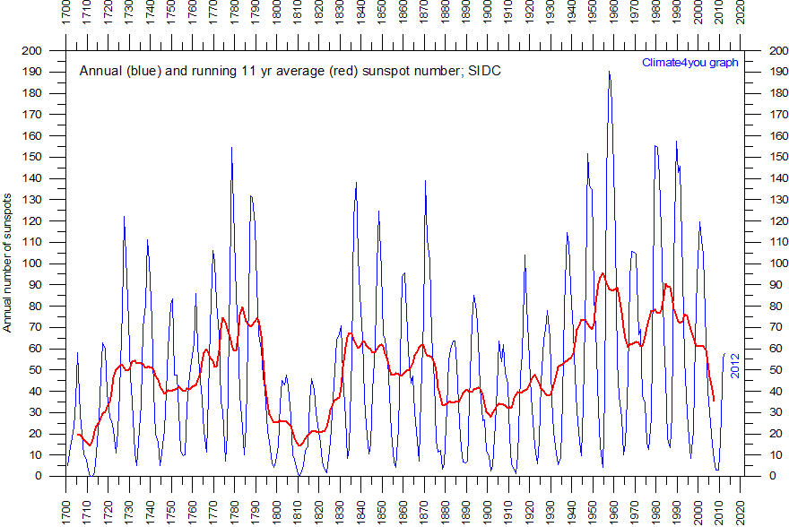 I believe the IPCC gets this wrong. Beginning somewhere in the second quarter of the twentieth century, the Earth began experiencing a “Modern maximum” in solar activity.  Sunspots, that are a proxy for solar activity, began a climb roughly at the time of Solar Cycle 15.  Solar Cycle 15 sunspots peaked at 105. The climb continued for the next four solar cycles.  Solar Cycle 19 had a peak sunspot number of 202.  Solar Cycle 19 ran from April 1954 to October 1964.  Solar cycles 20, 21, 22 and 23  showed a decline from the high point of cycle 19, but they were well above the norm.  The so-called “Modern maximum” does not appear to have any equivalent in the record all the way back to the 1700s.  The global temperatures climbed in unison with the increased solar activity.  Now we have entered more typical level of solar activity with the presence of Solar Cycle 24.  Cycle 24 is expected to peak at 70  67.