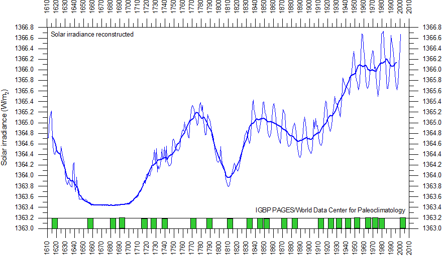 The naysayers point out that the solar radiation received at our upper atmosphere changes little from cycle to cycle.  No question that it maxed out during the Modern maximum but they don’t think the reduction is enough to make any difference. The naysayers are just not people from the IPCC but some pretty heavyweight solar scientists that appear to be skeptical of the man-made global warming theory.