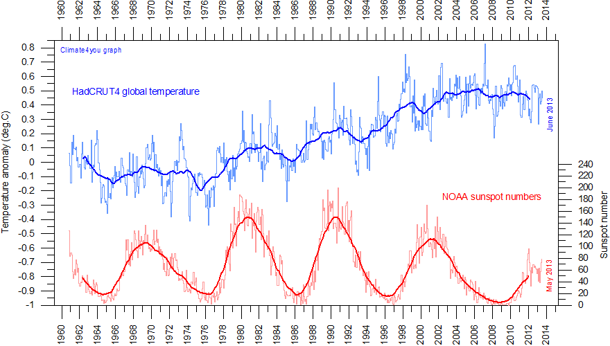 SunspotsandhadcruttempsMonthlyNOAA and HadCRUT4 GlobalMonthlyTempSince1960