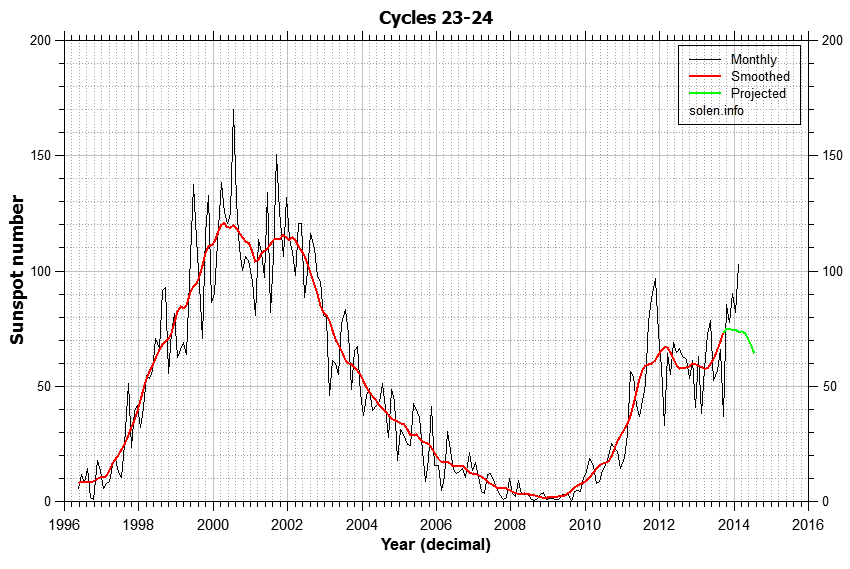 SILSO’s 2014 Solar Cycle 24 ISN sunspot projection for 2014 is shown below: