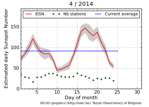 So far in April, the highest daily peak was been nearly 150. See the SILSO chart below: