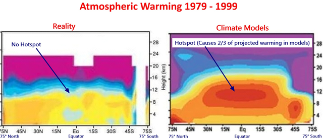 Figure 6: On the left is the data collected by millions of weather balloons. On the right is what the climate models say was happening. The theory (as per the climate models) is incompatible with the observations. In both diagrams the horizontal axis shows latitude, and the right vertical axis shows height in kilometers. (click on illustration to improve clarity.)