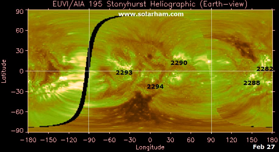 This image shows backside Sunspot areas, 2282 and 2288. It is forecast that these two will rotate into view in about 7-1/2 days and 8-1/2 days, respectively. This image is provided by two satellites that are orbiting around the Sun, essentially in Earth’s orbital path –one leading and one following Earth. These satellites are from the NASA “Stereo” Program. A video showing the orbital features can be seen by clicking on the link below.