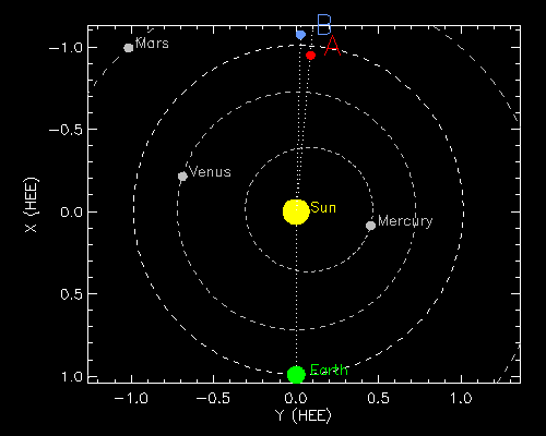 STEREO System is experience some problems as A and B are about 180 degrees away from the Earth’s position. This is causing the high gain antenna to experience unexpectedly high temperatures caused by pointing the antenna almost directly at the Sun in order to transmit information to Earth. NASA has changed the protocol somewhat to protect the high gain antennas and thus the transmission quality is suffering. NASA says by January 2016 the system will be back to normal. This chart illustrates the orbital positions for 28 February 2025.