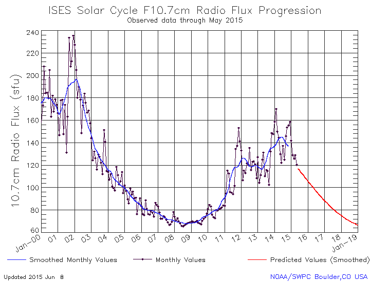 Below is the NOAA chart for F10.7cm solar flux from January 2000 to May of 2015. The smoothed curve compares closely to the Sunspot charts. Could be a good substitute for Sunspots.