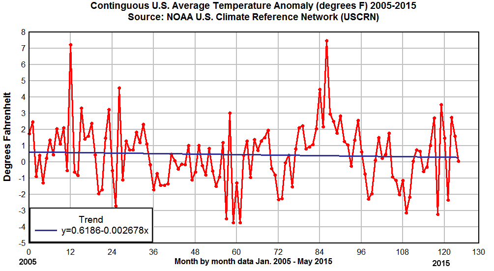 This chart is a plot of the readings as they are reported from the temperature monitoring stations. The X-axis show the period from 2005 to the present. What seems obvious is that the US temperature has declined, albeit slightly, but declined rather than increased as the homogenized temperature for the same period on Figure 1.