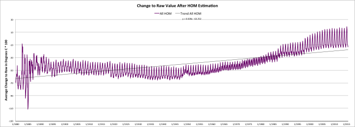 FIGUIRE 1: CHANGE TO RAW DATA AFTER HOMOGENIZATION ESTIMATIONThe Y-axis it “average change to raw in degrees C x100. The X-axis is years beginning in 1880 to the present.