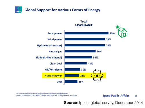 “Governments discriminate against nuclear energy because it is deeply unpopular. Globally, the opinion research firm Ipsos found that nuclear’s approval rating is just 28 percent – just three percent higher than coal, the least popular fuel – while solar and wind are supported by 85 and 78 percent of the public. And for the first time in twenty years, only a minority of Americans told Gallup they support nuclear as part of the electricity mix – just 44 percent in 2016, compared to 61 percent in 2000”.