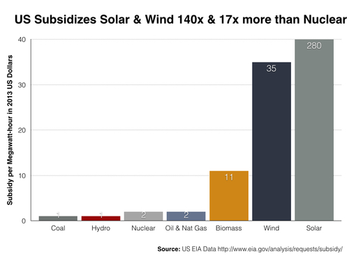 “Everywhere the underlying reason is the same: anti-nuclear forces, in tandem with rent-seeking economic interests, have captured government policies. On one extreme lies Germany, which decided to speed up the closure of its nuclear plants following Fukushima. In Sweden the government imposed a special tax on nuclear. In the U.S., solar and wind receive 140 and 17 times higher levels of subsidy than nuclear. And states across the nation have enacted Renewable Portfolio Standards, RPS, that mandate rising wind and solar, and that exclude nuclear.”