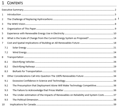 A number of environmental groups in Canada and other countries have recently endorsed the “100% Clean and Renewable Wind, Water and Sunlight (WWS)” vision articulated in reports written by Mark Jacobson, Mark Delucci and others. This vision seeks to eliminate the use of all fossil fuels (coal, oil and natural gas) in the world by 2050. Jacobson, Delucci et. al. have published “all-sector energy roadmaps” in which they purport to show how each of 139 countries could attain the WWS goal. The purpose of this paper is to examine whether the 100% goal is feasible.