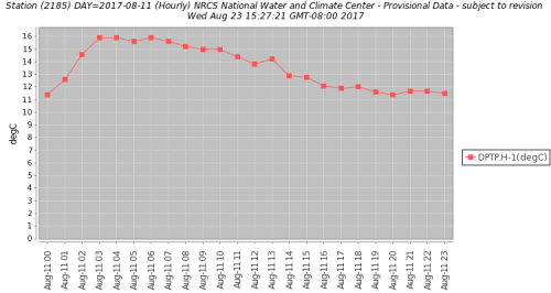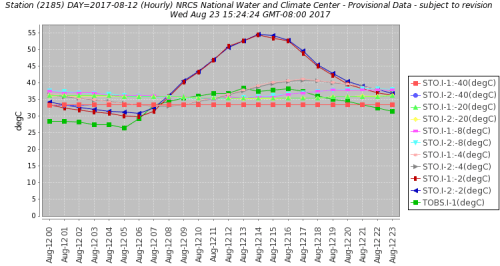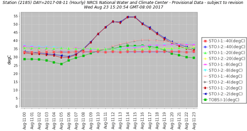 The graphical display of SCAN data, as seen in Fig 1, of the measurements of the soil temperatures (STO.I) being measured at 2, 4, 8, 20, and 40 inch (in) depths and the air temperatures (TBOS) is immensely valuable. Such monthly displays of daily measurements allow one to simply compare one day’s measurements with the others of the month even though some details can be difficult to discern. So in the case of Fig. 1, it is not difficult to see that many of the maximum soil temperatures at the 2in depth of August 2017 were comparable to Brehmer’s averaged surface temperatures. I could see the days 8/11 and 8/12 had the highest 2in temperatures. So I quickly switched to the hourly plots for those days (Fig 2,3) to better see each of their highest air temperatures ( about 37C and 38C. If I needed more precise values for these temperatures, I could have quickly switched to the data file, knowing the nearest hour of these highest temperatures, to access the precise temperatures actually measured. But knowing the highest 2in temperatures were about 55C and the highest air temperatures were no higher than about 38C was sufficient to support the validity of Brehmer’s averaged high temperatures and the difference between the soil temperature and the air temperature. Which I considered was observational evidence which refuted the argument of the GHE proponent.
