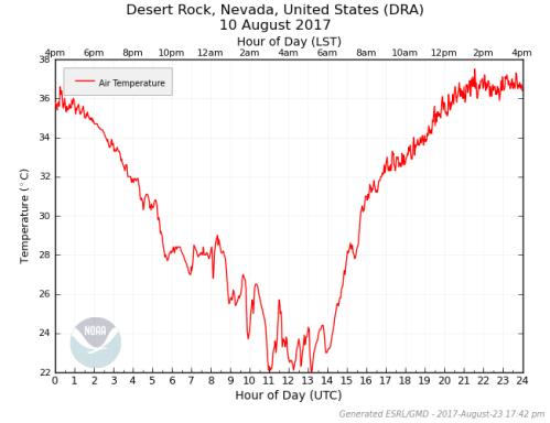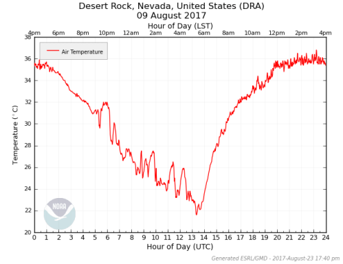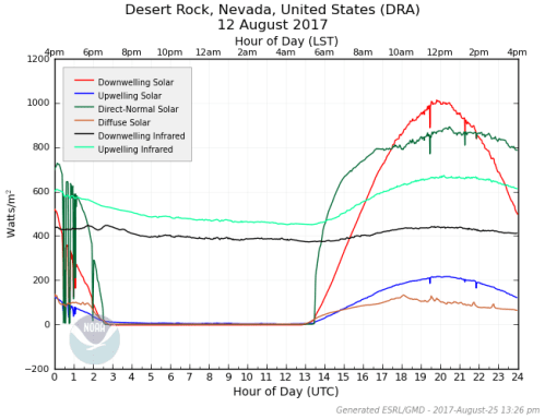 A distinct difference between SURFRAD data and the SCAN data is that the SURFRAD data is being recorded each minute instead of each hour as is the case of SCAN measurements. Hence, very rapid actual changes of any measured values can now be seen as you should have noticed as you briefly scanned the figures. But because the sole purpose of this essay is to only refute the idea of GHE, we will only use the Upwelling IR radiation, which can be seen (Fig 6, 8, 10, and 12) to change the least, to indirectly determine the minimum surface temperature by using the well accepted Stefan-Boltzmann radiation law (SBL). The minimum, not actual, surface temperature, because a property, the emissivity of a surface, is part of the law and we do not know the soil surface’s emissivity. But we can assume the maximum possible value (1) for this unknown property and know that if the surface’s emissivity is less, that actual emitting temperature has to be greater (higher) than the minimum possible calculated. Of course, we do this to validate extreme temperature measured by Brehmer, measured at the 2in soil depth at the Essex CA SCAN site, and now the indirectly calculated minimum-maximum surface temperatures at the Desert Rock MV SURFRAD site.