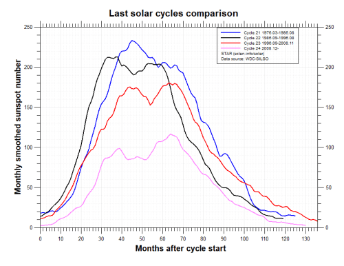 SC 21, 22, 23 and 24 are plotted on the following chart. Comparing SCs 21, 22, 23 to SC 24 makes evident the low activity of SC24. The Chart is courtesy of Solan Info.