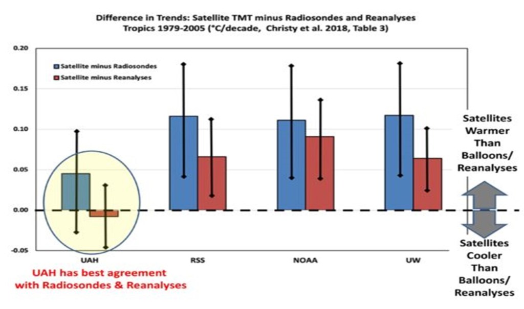 The satellite systems for measuring temperatures were pioneered by Roy Spencer and John Christy. Their University of Alabama at Huntsville (UAH) satellite began making measurements in 1979. The satellite does not measure temperature directly. It uses microwave sensing of oxygen calibrated to temperature. Over time it has been joined by other satellites using similar equipment. The others are RSS, NOAA, and the University of Washington. At one time they tracked one another but then they made a change. In my opinion, because their readings are warmer than UAH, they are now considered the “standard. Historically, UAH reports warming at +0.14C/decade and the others read +0.208C/decade.