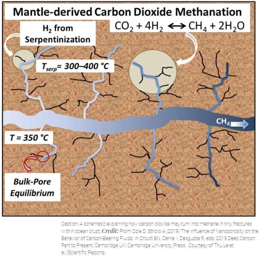 —> Fischer-Tropsch reactions proceed as follows: CO + 3H2, under Reducing Conditions (O2 deficient) and in the presence of an Iron or Cobalt catalyst and starting at 350C, yields methane and water. Further dwell time in a geological “trap” will produce petroleum — in unimaginable quantities. Sabatier reactions perform in much the same way with with CO2 instead of CO catalysts of Vanadium and Silica. CO2 methanation.