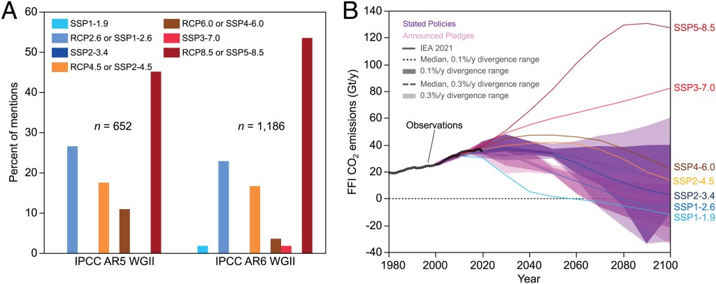 The box on the left’s Y axis show the percent of forecasts made using the various CO2 emissions paths. The X axis is the forecasts during the IPCC Assessment Report (AR5) in 2014 and the IPCC AR 6 in 2022. The bars show the use of the different CO2 forecasts to make their predictions. It is apparent that the Alarmists felt that they need to do more frightening by the fact that more predictions using the massive CO2 atmosphere prediction than they did in 2014. The forecast using the line I said was the mix of renewables and fossil fuel was nearly non-existent. The massive CO2 was used more than any of the remaining lines that essentially forecasting fossil fuel use going to zero.