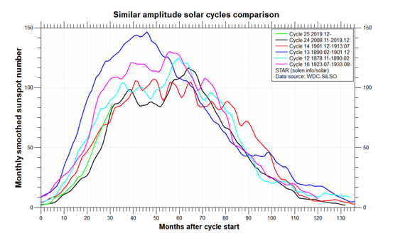 The comparison of SC 24 and SC 25 when viewed at the same amount of time after the cycles started make them look like they are on the same track. Look at about 30 to 31 months after cycle start, the green line (SC 25) and the brown line (SC24) essentially at the same place. Graph curtsey of Solen.com
