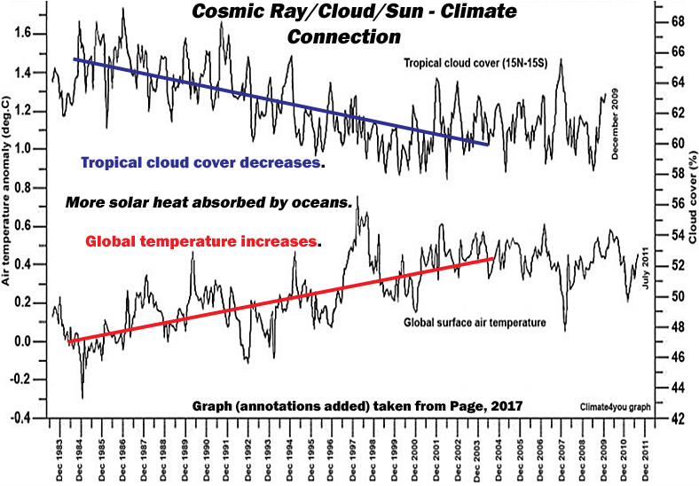 “In 1995, Henrik Svensmark discovered a startling connection between the cosmic ray flux from space and cloud cover. He found that when the sun is more active–more sunspots, a stronger magnetic field, larger auroras, stronger solar winds, etc.–fewer cosmic rays strike the earth and cloud cover is reduced, resulting in warmer temperatures.” When the sun is inactive, more of them penetrate the atmosphere. Upon reaching the lower atmosphere where more sulphur dioxide, water vapor, and ozone is present, the cosmic rays ionize the air, releasing electrons that aid in the formation of more CCN and form more dense clouds. This increase in low-cloud amount reflects more solar energy to space, cooling the planet.”