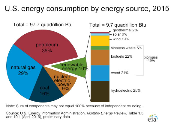 The Energy Information Administration’s(EIA)**, chart on the primary energy sources for the year 2015 is shown below.