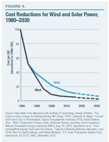 Future advances in wind turbine and solar economics are now centered on incremental engineering improvements: economies of scale in making turbines enormous, taller than the Washington Monument, and similarly massive, square-mile utility-scale solar arrays. For both technologies, all the underlying key components—concrete, steel, and fiberglass for wind; and silicon, copper, and glass for solar—are all already in mass production and well down asymptotic cost curves in their own domains.