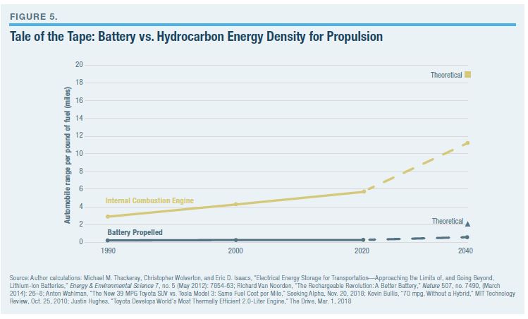 There are no subsidies and no engineering from Silicon Valley or elsewhere that can close the physics-centric gap in energy densities between batteries and oil (Figure 5). The energy stored per pound is the critical metric for vehicles and, especially, aircraft. The maximum potential energy contained in oil molecules is about 1,500% greater, pound for pound, than the maximum in lithium chemistry.82 That’s why the aircraft and rockets are powered by hydrocarbons. And that’s why a 20% improvement in oil propulsion (eminently feasible) is more valuable than a 200% improvement in batteries (still difficult).