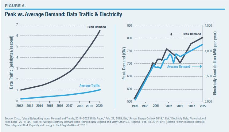 In the energy world, one of the most vexing problems is in optimally matching electricity supply and demand (Figure 6). Here the data show that society and the electricity-consuming services that people like are generating a growing gap between peaks and valleys of demand. The net effect for a hydrocarbon-free grid will be to increase the need for batteries to meet those peaks.