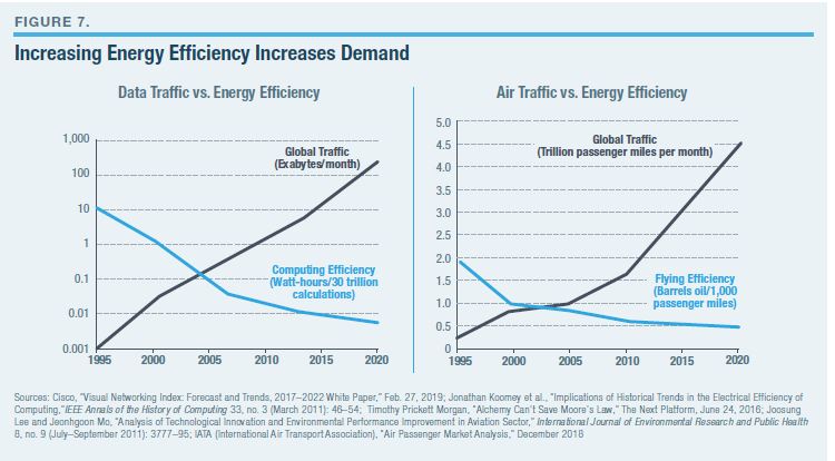 The purpose of improving efficiency in the real world, as opposed to the policy world, is to reduce the cost of enjoying the benefits from an energy-consuming engine or machine. So long as people and businesses want more of the benefits, declining cost leads to increased demand that, on average, outstrips any “savings” from the efficiency gains. Figure 7 shows how this efficiency effect has played out for computing and air travel.91