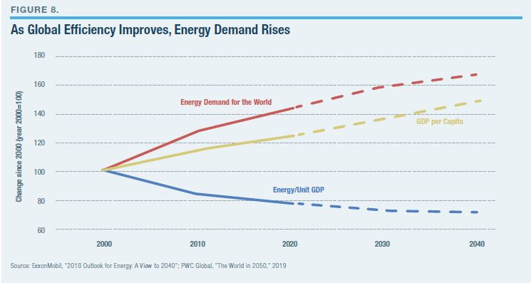 Of course, the growth in demand growth for a specific product or service can subside in a (wealthy) society when limits are hit: the amount of food a person can eat, the miles per day an individual is willing to drive, the number of refrigerators or lightbulbs per household, etc. But a world of 8 billion people is a long way from reaching any such limits.
