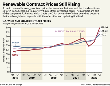 This chart comes from a posting by Inside Climate News (https://insideclimatenews.org/news/20102022/inside-clean-energy-wind-solar-prices/. )The author adds this:
