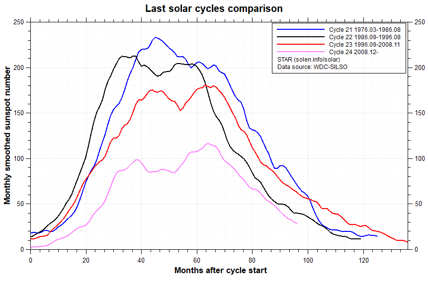 The following chart compares Cycles 23, 24 and the predicted Cycle 25: