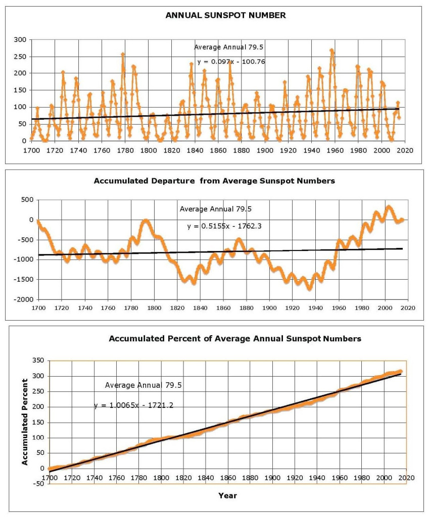 The three charts above were posted on WUWT website titled “Trends in the Revised Sunspot Number Dataset“.  From that posting comes the following analysis: